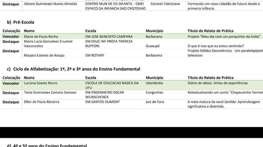 Vencedor do ciclo de Alfabetização: 1º, 2º e 3º ano do Ensino Fundamental Publicado em 06/11/201821/07/2020 por Luciana Soares Muniz Relato de prática: Diário de Ideias – Linhas de experiencias Resultado da etapa estadual Resultado da etapa estadual Resultado da etapa regional